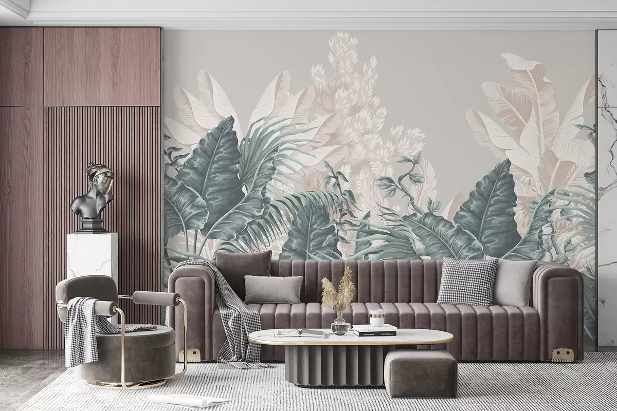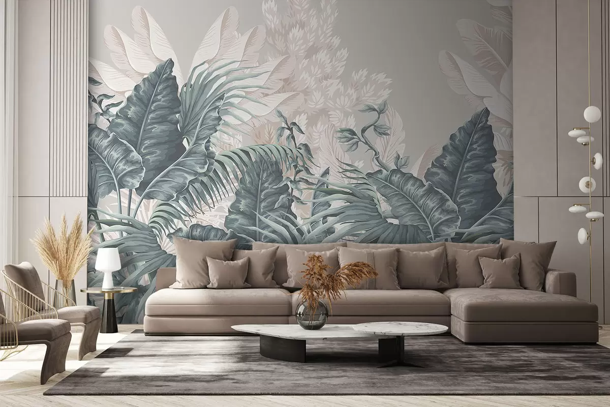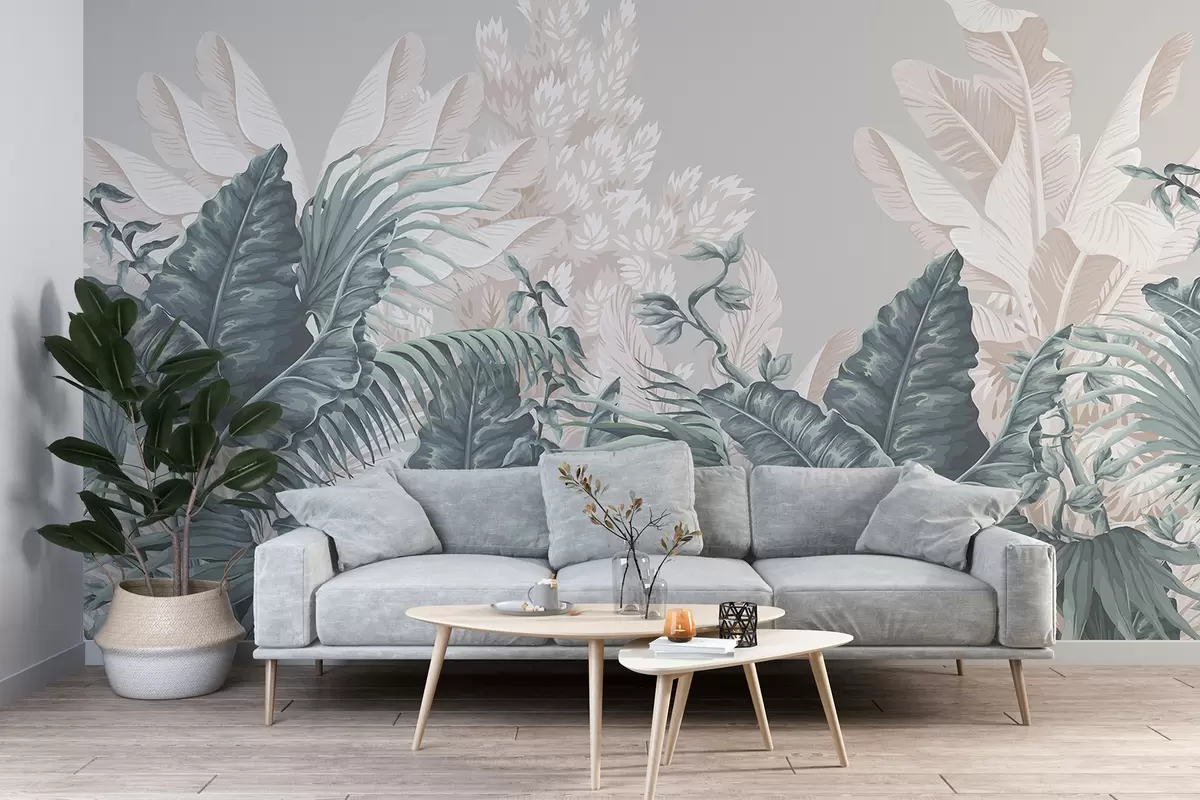 Fotomurales Una escena de jungla tropical con grandes hojas verdes y flores en primer plano, creando una atmósfera exuberante. Nr. w08242