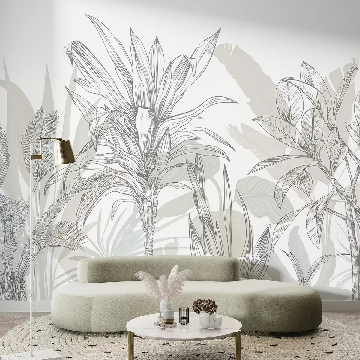 Fotomurales Un gráfico de plantas tropicales con grandes y exuberantes hojas y flores en tonos grises y blancos con siluetas florales verdes Nr. w08327