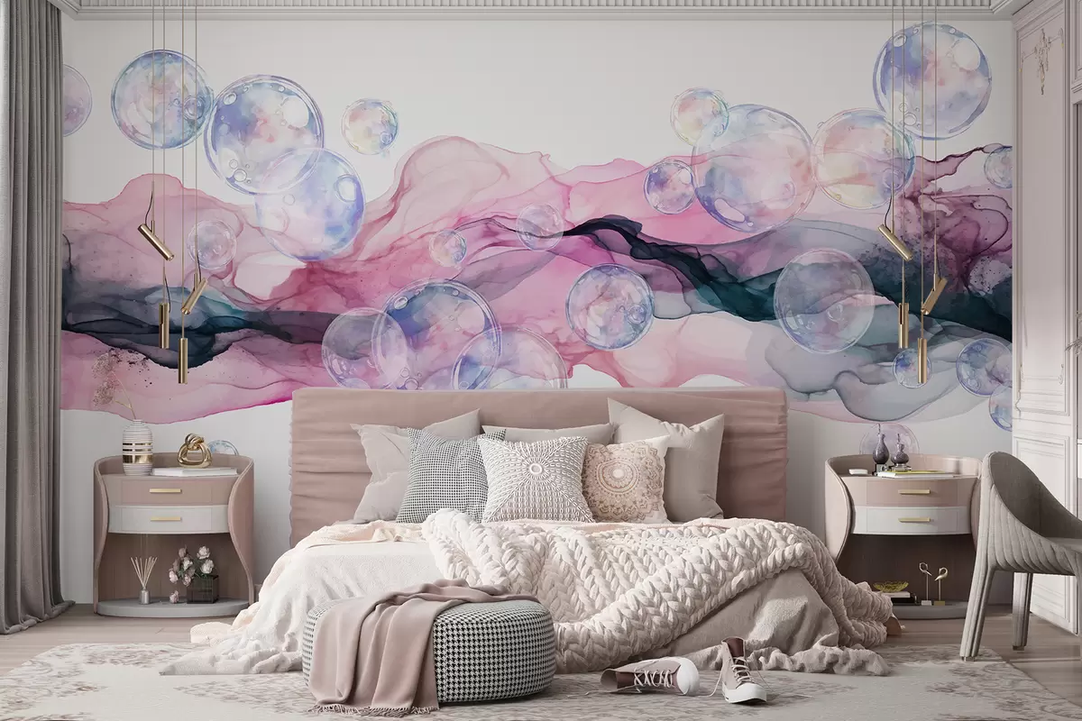 murales de pared Coloridas formas fluidas abstractas con burbujas, remolinos de tonos rosas, azules y morados sobre fondo blanco w08337
