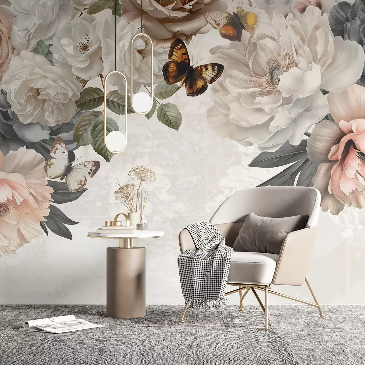 Fotomurales Grandes flores de peonía blancas y rosas con una mariposa posada en una de las flores sobre un fondo suave y difuminado Nr. w08340