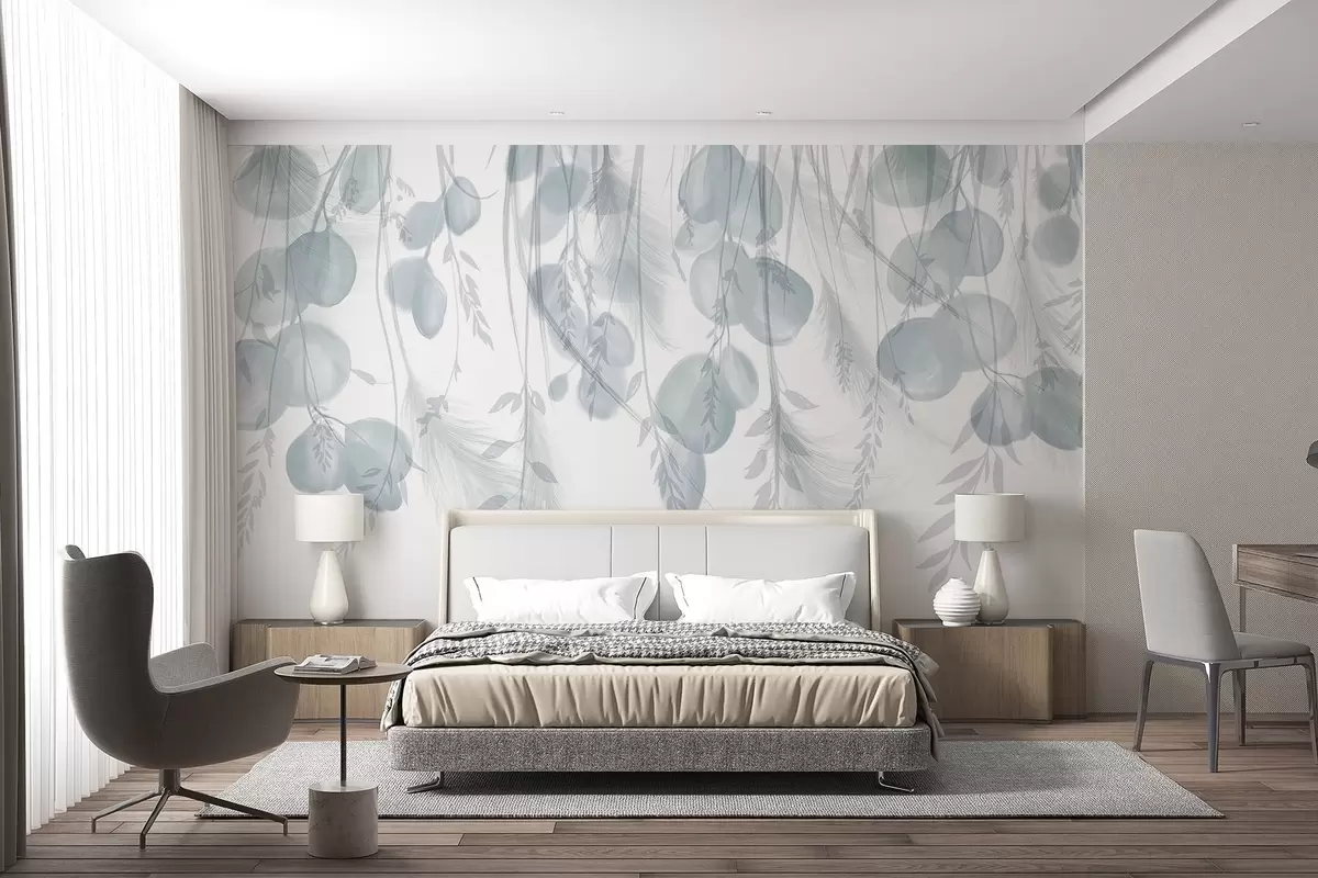 Fotomurales Delicadas hojas de eucalipto grises y verde pastel cayendo, creando una atmósfera serena y tranquilizadora Nr. w08380
