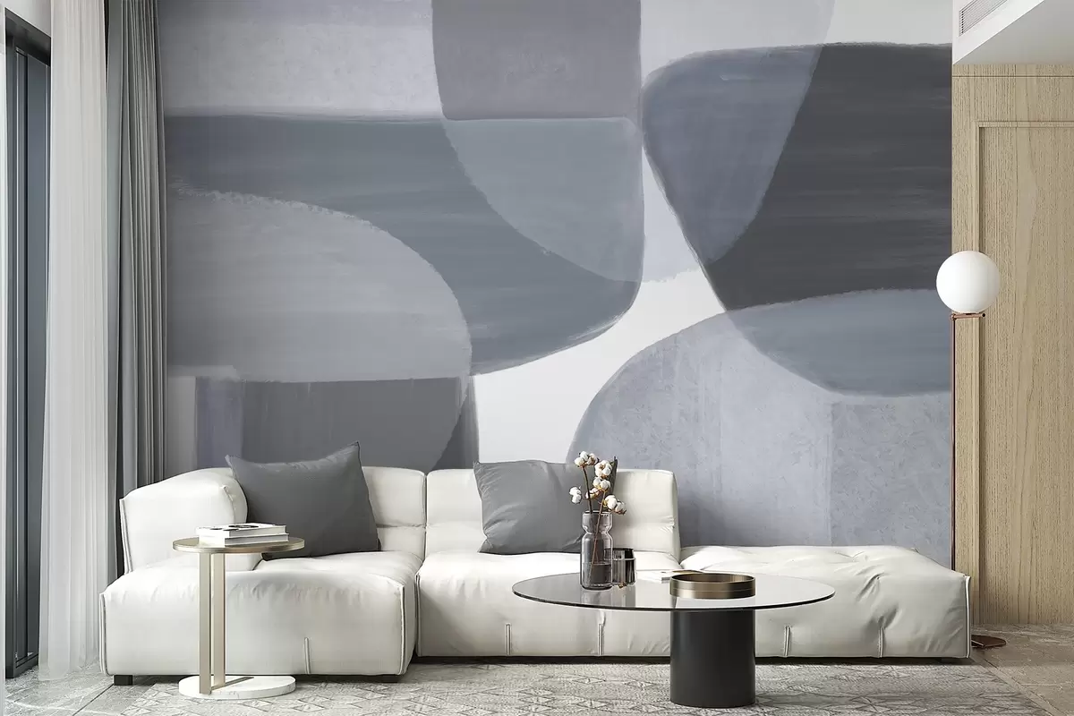 murales de pared Un estampado abstracto monocromo con formas minimalistas superpuestas en tonos grises y azules. w08410