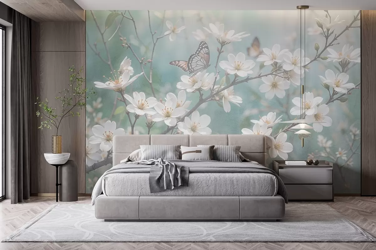 Fotomurales Una mariposa blanca sobre una rama con delicadas flores blancas de cerezo en primer plano sobre un fondo difuminado Nr. w08421
