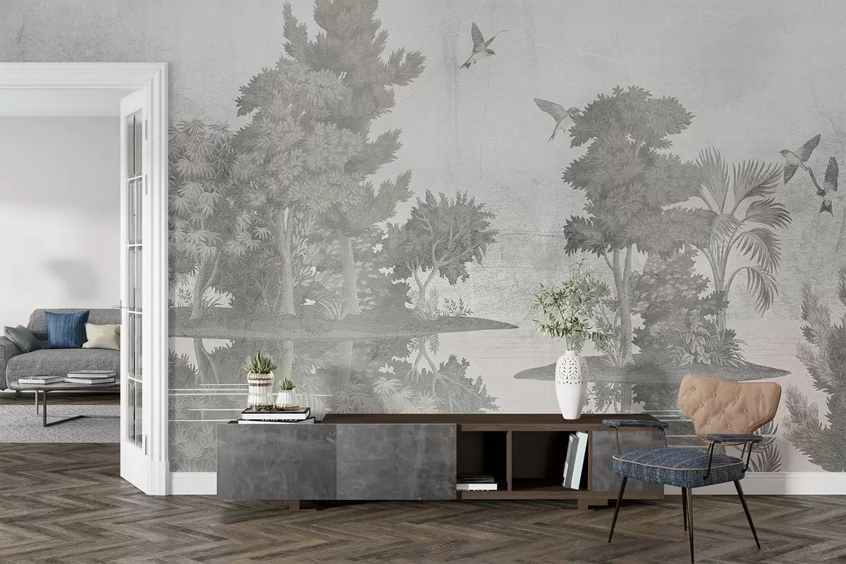 Fotomurales Impresión de un paisaje forestal con un lago rodeado de pinos y otro follaje sobre un fondo verde texturizado Nr. w08426v1
