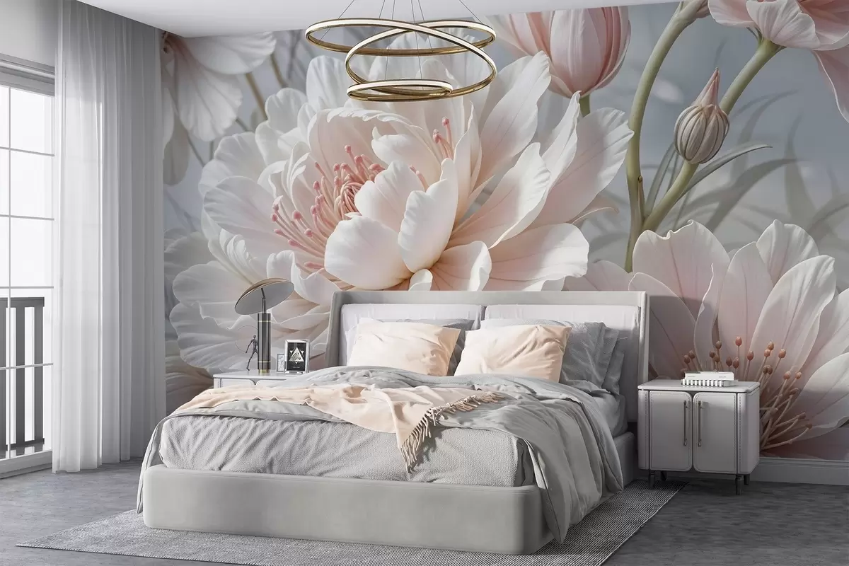 murales de pared Grandes y delicadas flores de peonía blancas y rosas con pétalos suaves y esponjosos sobre un fondo gris difuminado w08427