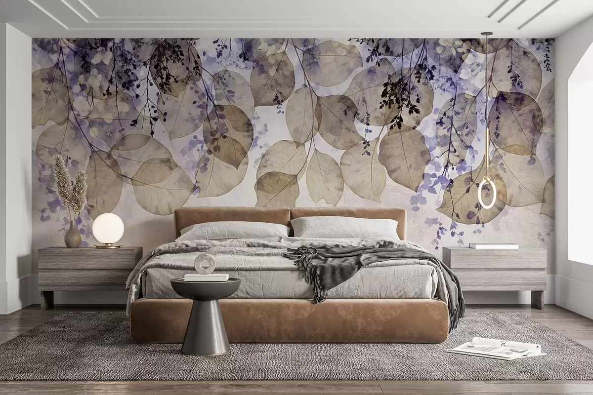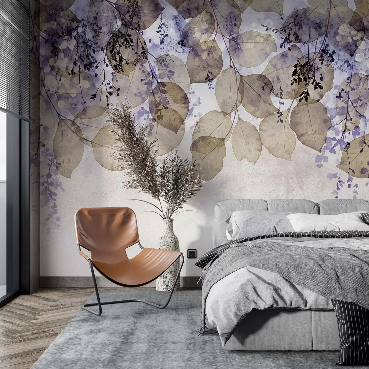 murales de pared Delicadas hojas secas y flores en tonos púrpura, beige y blanco sobre un fondo de textura ligera w08447