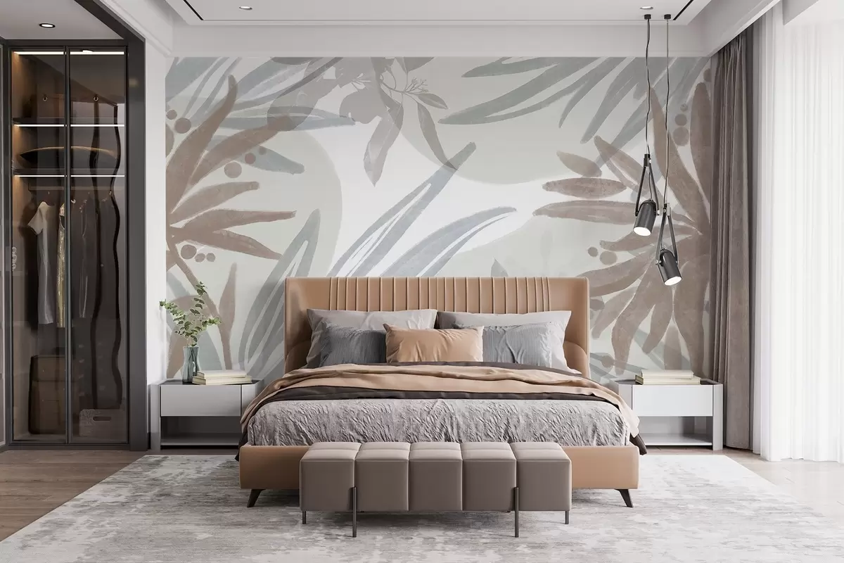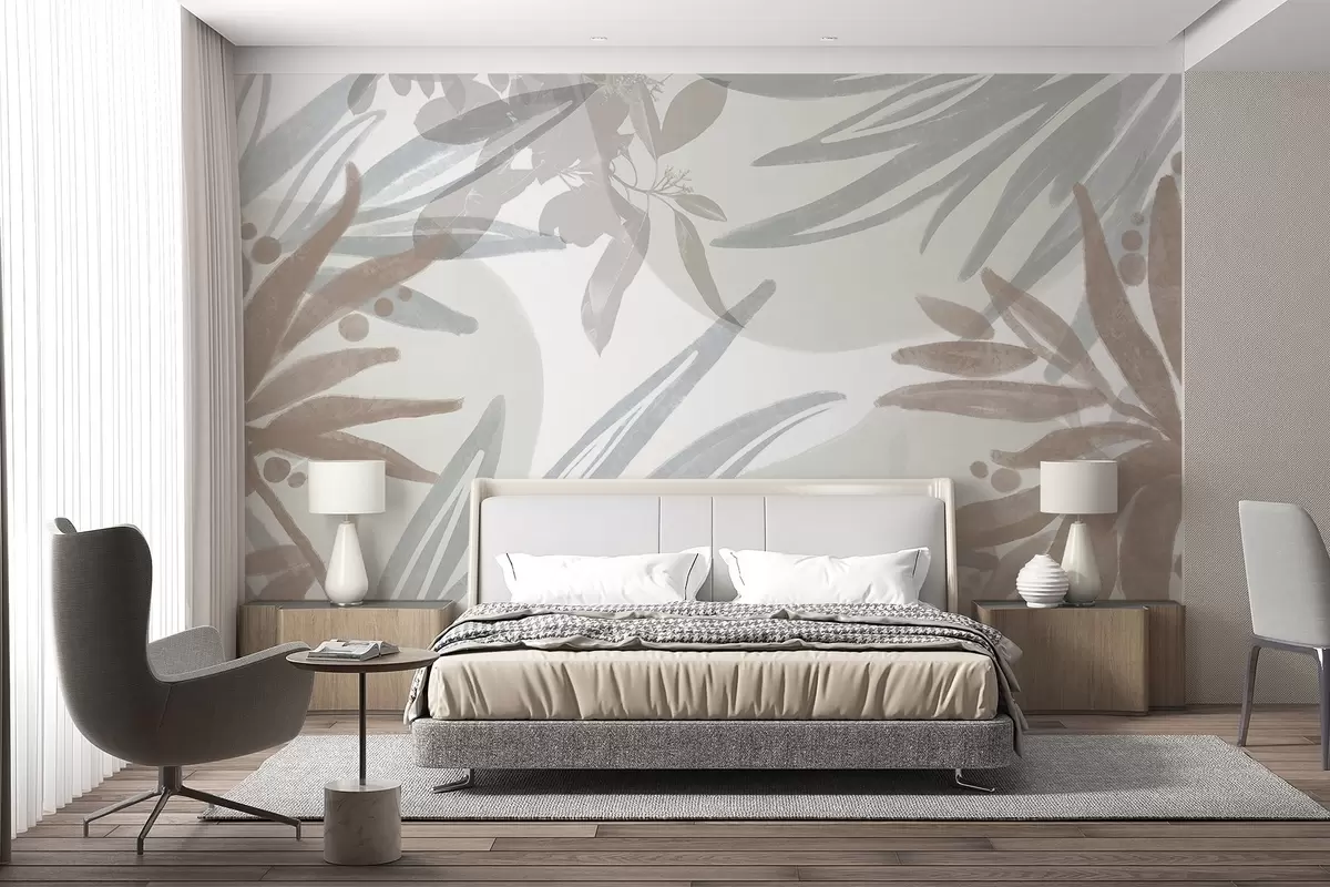 Fotomurales Un motivo floral abstracto de tonos neutros con hojas y formas superpuestas en tonos grises, blancos y beige Nr. w08464
