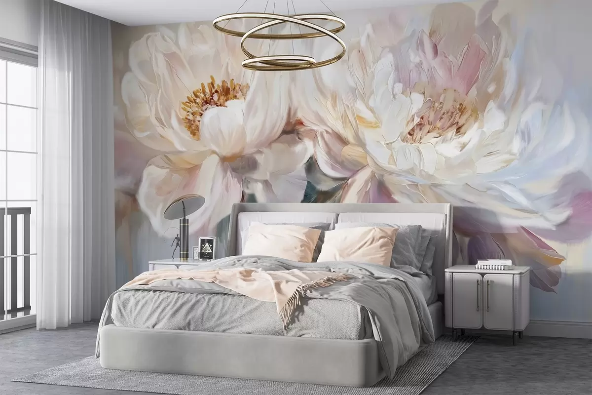 Fotomurales Suaves y delicadas peonías blancas y rosa pastel con exuberantes pétalos sobre un fondo difuminado que imita una pintura Nr. w08466