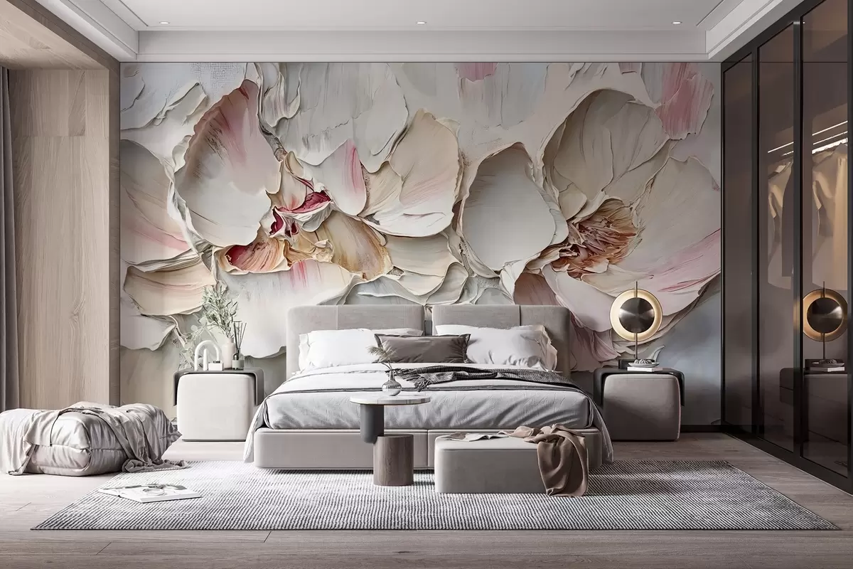 Fotomurales Delicadas flores de color rosa pálido con suaves pétalos en capas sobre un fondo de textura apagada imitación de pintura al óleo empastada Nr. w08467