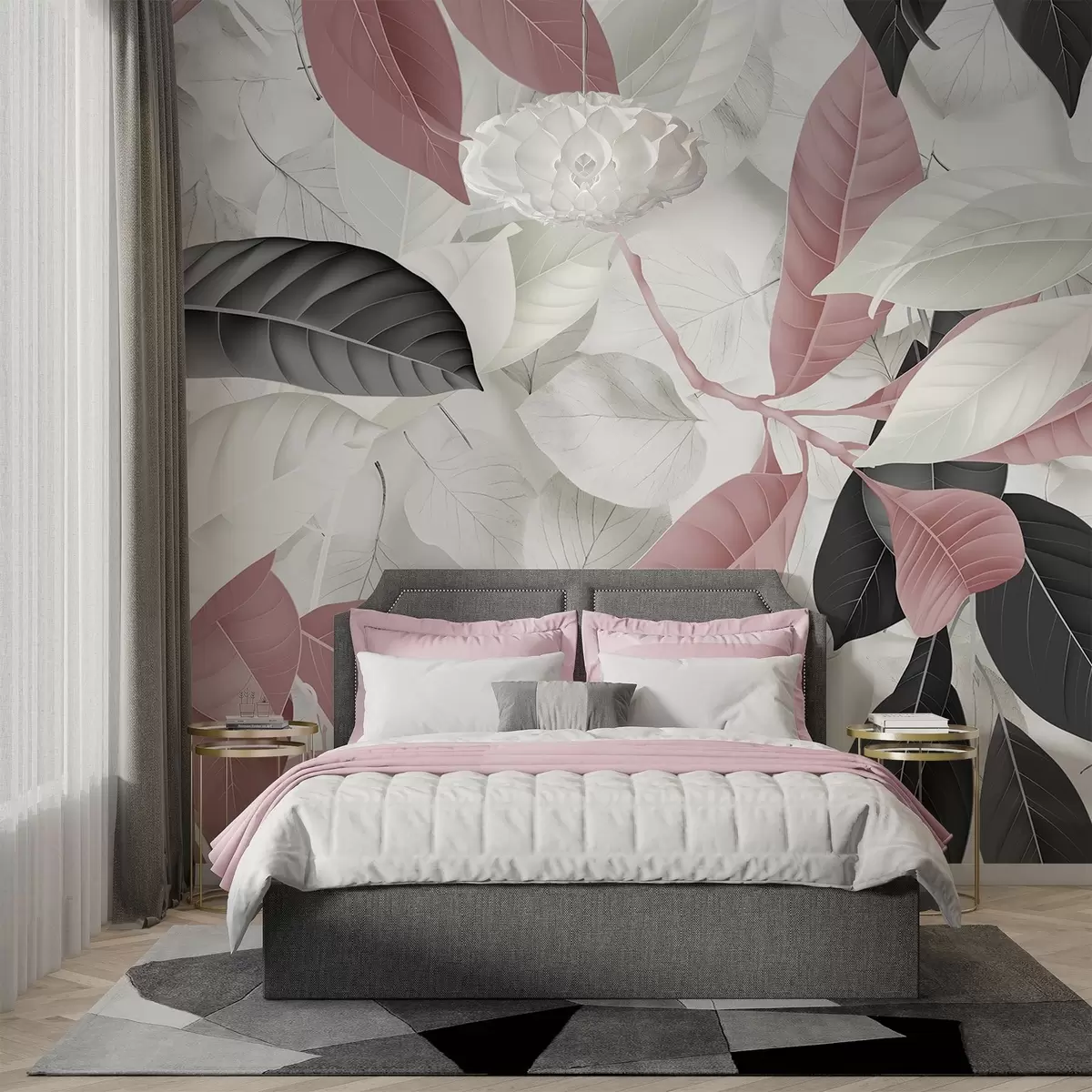 Fotomurales Gran estampado de hojas rosas y grises sobre un fondo con textura de hojas claras, que crea una exuberante sensación tropical Nr. w08468