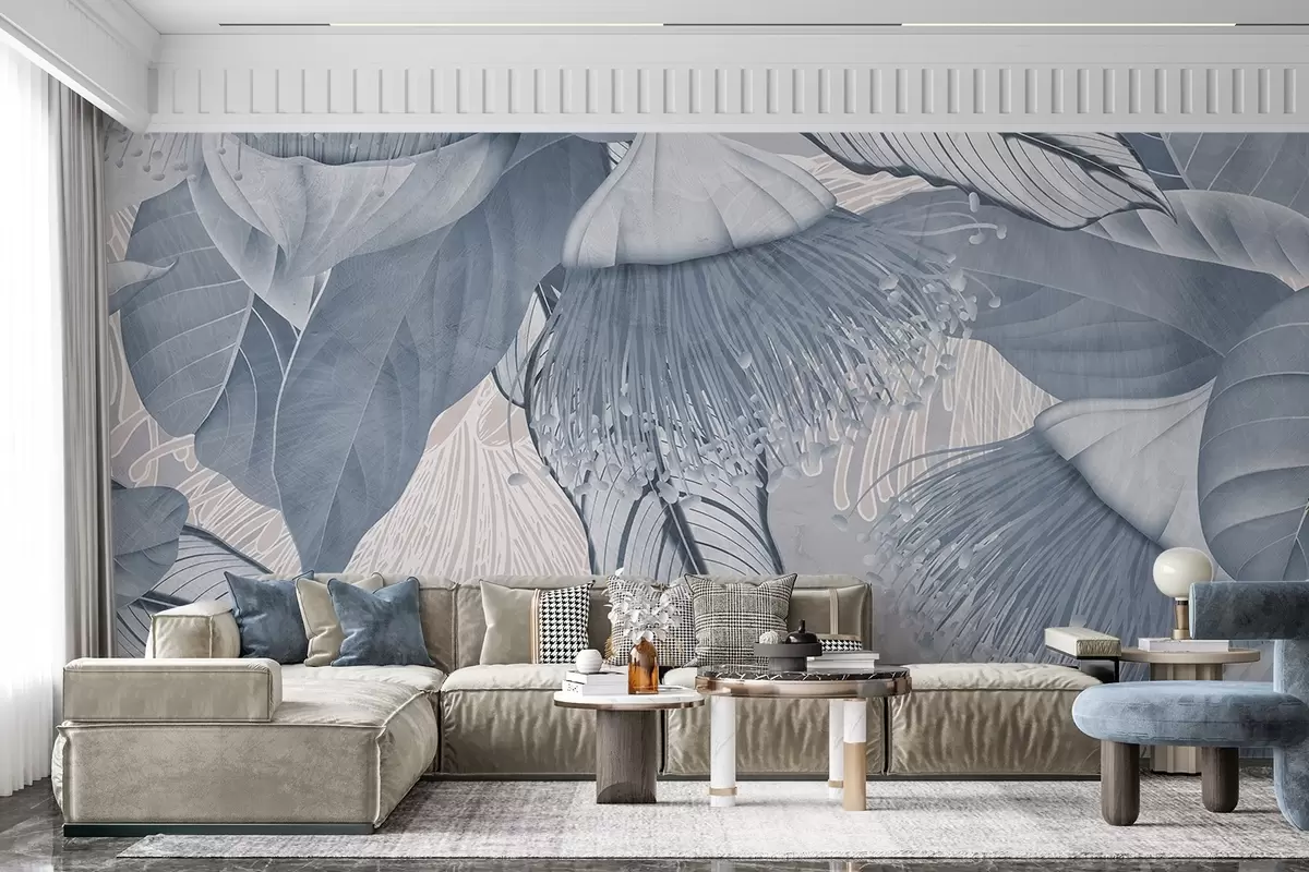 murales de pared Ilustración botánica de grandes flores azules de eucalipto con largos estambres sobre un fondo gris y blanco w08539v1
