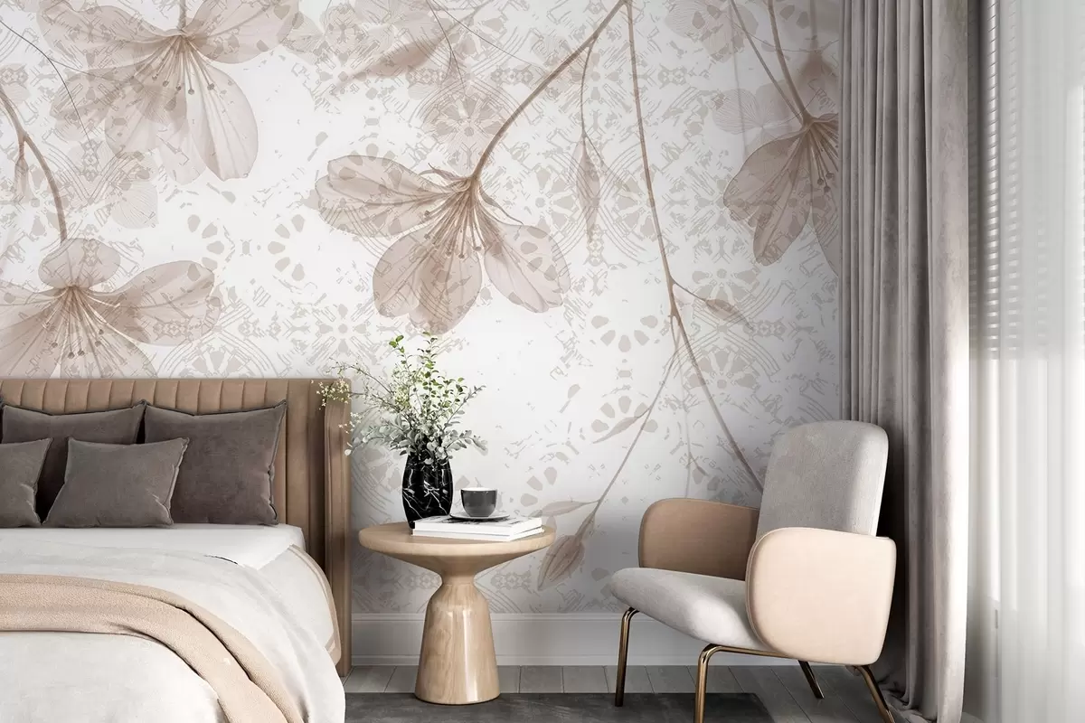 murales de pared Delicadas flores beige y blancas con largos tallos y pétalos sobre un fondo de textura suave y difuminada w08588v1