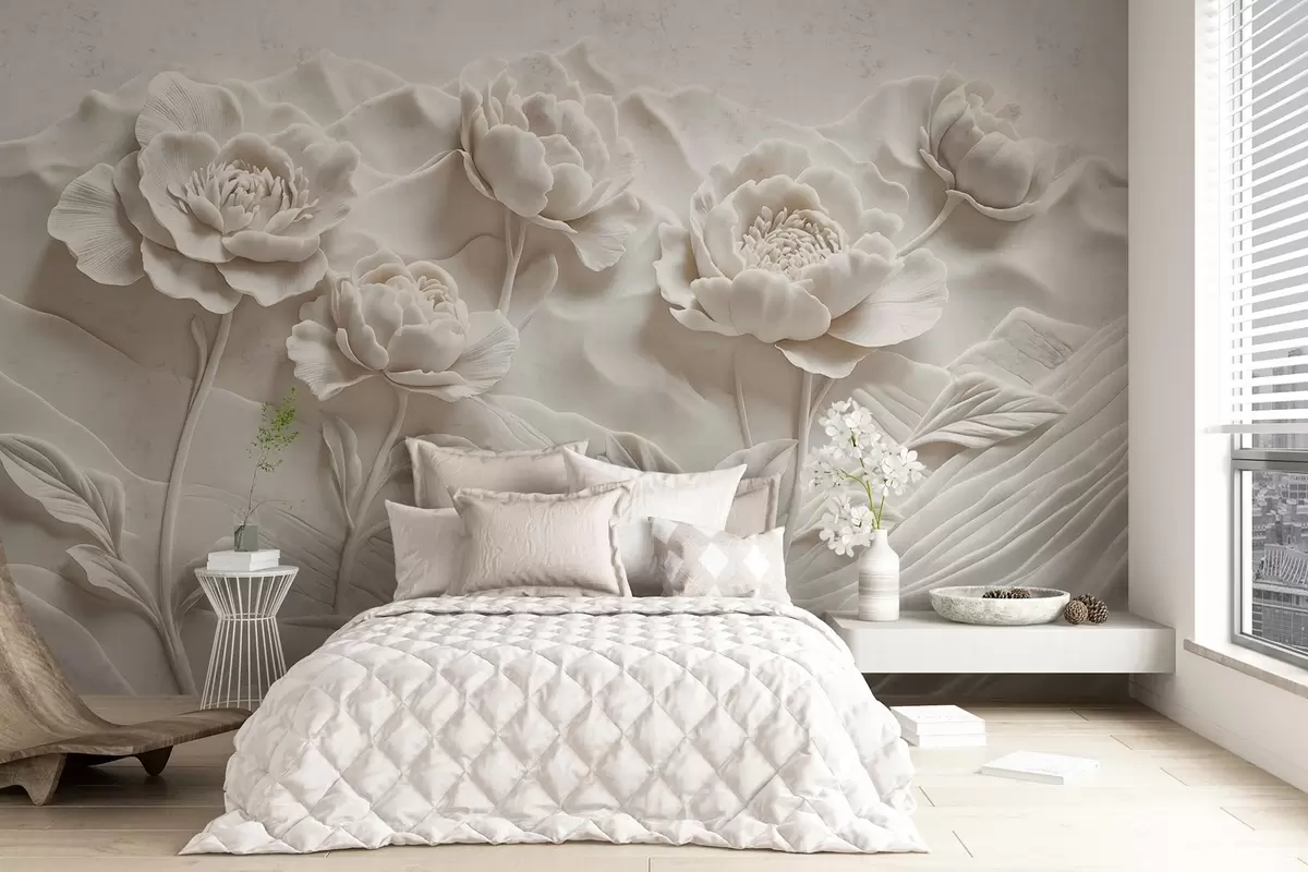 murales de pared Imitación floral blanca de escultura en relieve con grandes y detalladas flores de peonía sobre fondo liso w08612