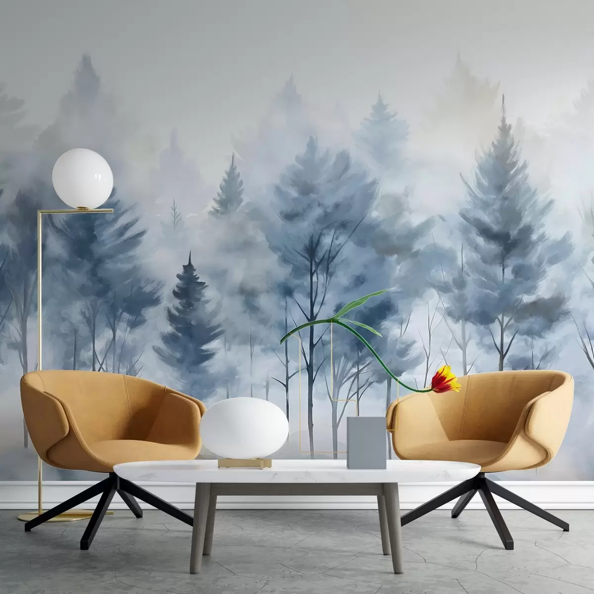Fotomurales Un paisaje de bosque brumoso con altos pinos y árboles caducifolios desnudos en primer plano acuarela imitación arte Nr. w08643