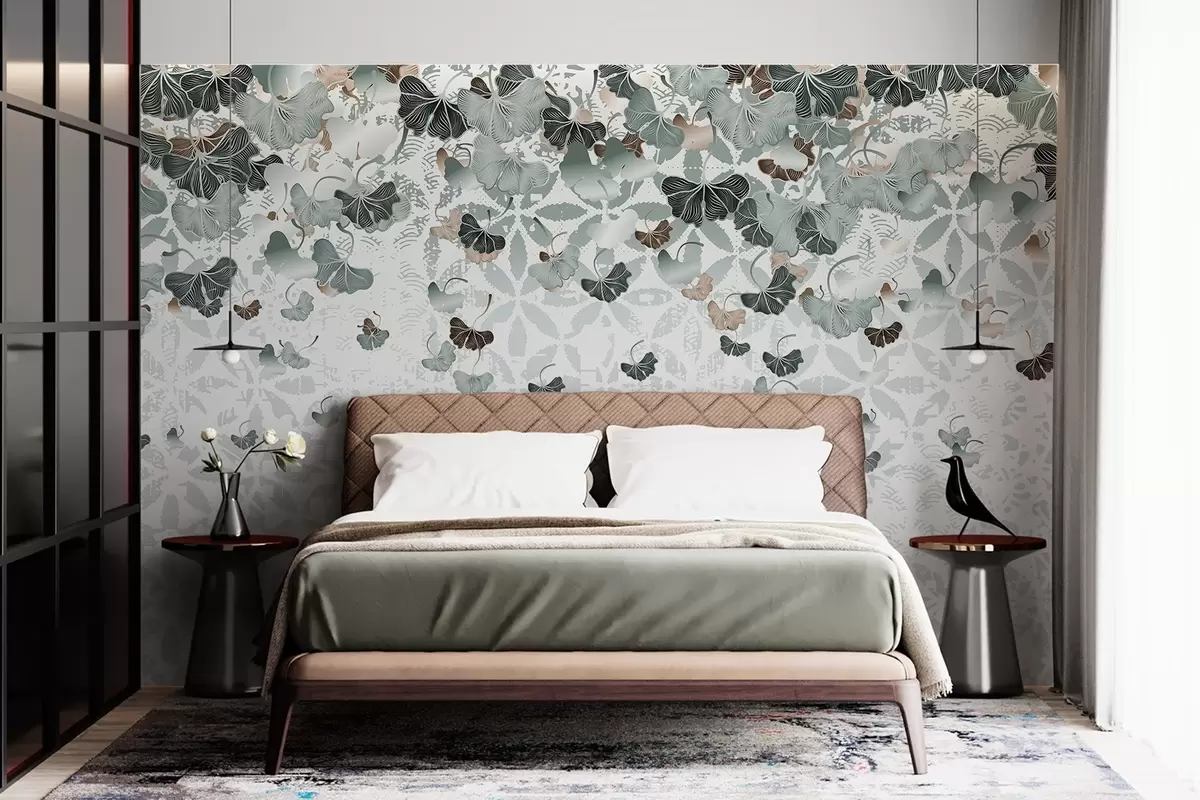Fotomurales Hojas de ginkgo en cascada en tonos verdes y marrones, sobre un fondo texturizado con motivos florales Nr. w08662