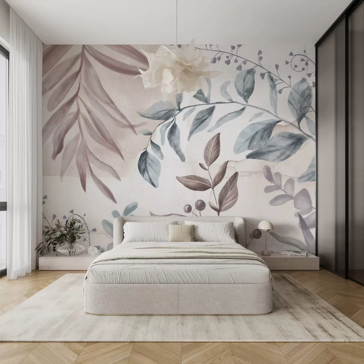 Fotomurales Estampado botánico con hojas y ramas florales en suaves colores pastel, sobre fondo de acuarela Nr. w08668