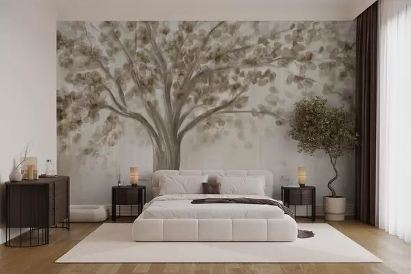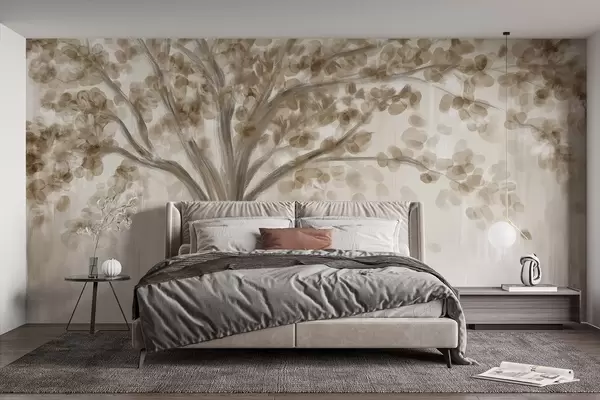 Fotomurales Un gran árbol con hojas suaves y abstractas de color beige sobre un fondo claro y neutro que realza los tonos del árbol Nr. w08669