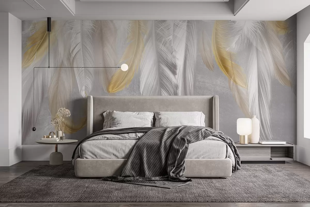 Fotomurales Plumas blancas y amarillas que cuelgan sobre un fondo gris suave, creando una composición delicada y aérea Nr. w08670