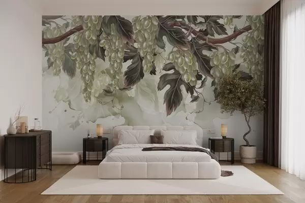 Fotomurales Uvas colgando de una parra con hojas verdes, sobre un fondo claro con texturas tipo acuarela Nr. w08696