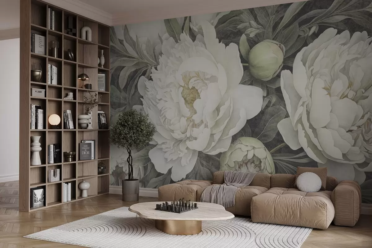 Fotomurales Peonías blancas pastel texturizadas con suaves capullos verdes y hojas con delicados pétalos Nr. w08697