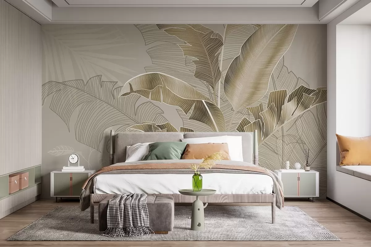 Fotomurales Una armoniosa composición de hojas tropicales en tonos beige y marrón, con un detallado trabajo de líneas Nr. w08698