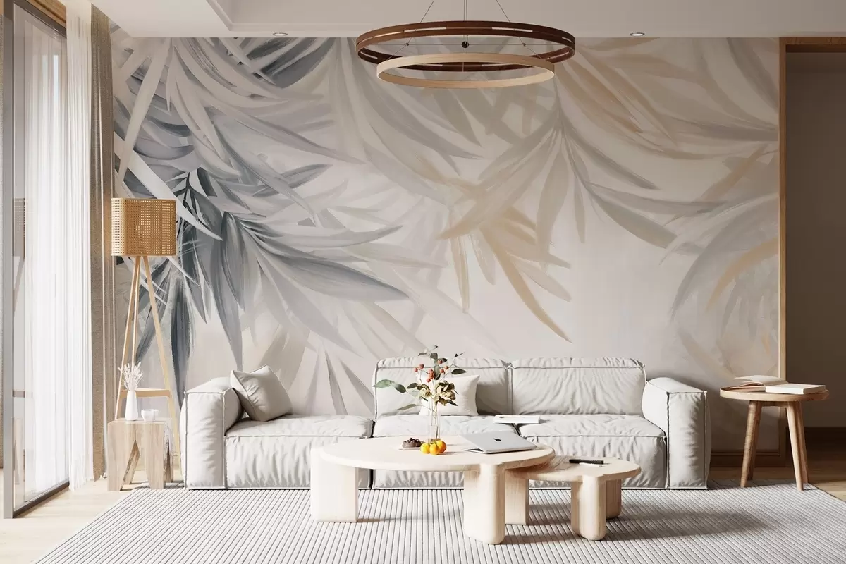 Fotomurales Suaves y fluidas hojas tropicales de color claro en tonos grises y melocotón, que se funden en un estampado pálido y neutro Nr. w08703