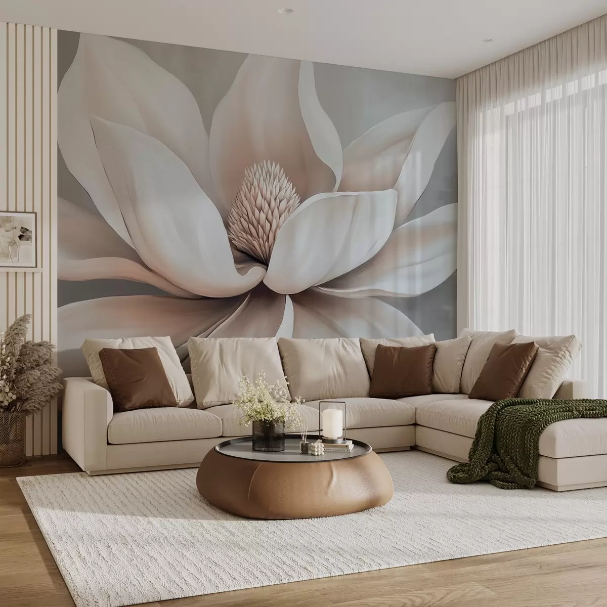 murales de pared Elegante flor de magnolia con pétalos largos y suaves sobre un fondo gris suave w08705