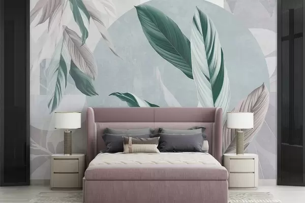 murales de pared Composición geométrica moderna y abstracta de textura con hojas detalladas en tonos verdes, morados claros y blancos w08741v1