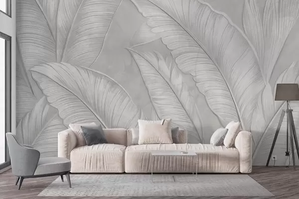 Fotomurales Grandes hojas tropicales detalladas con gran textura en un color gris claro monocromático de estilo loft Nr. w08772