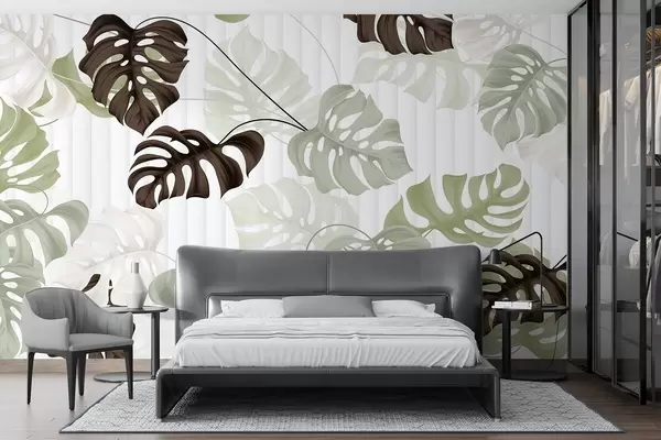 Fotomurales Hojas de Monstera en tonos verdes, blancos y marrones oscuros, sobre un fondo claro de textura rayada Nr. w08773