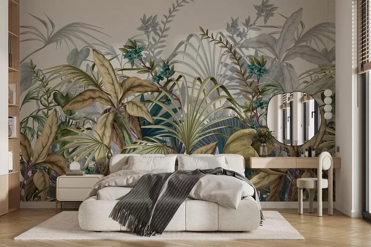 Fotomurales Arreglo de varias plantas tropicales con grandes hojas vibrantes, creando una exuberante escena de follaje sobre un color beige claro Nr. w08777v1