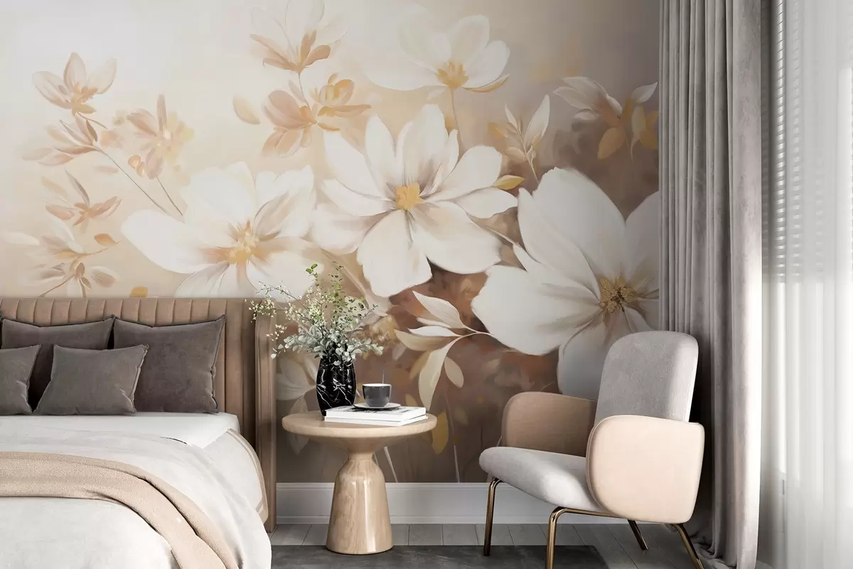 Fotomurales Flores pintadas de blanco con suaves pétalos y delicadas hojas, sobre un fondo beige claro y crema Nr. w08780