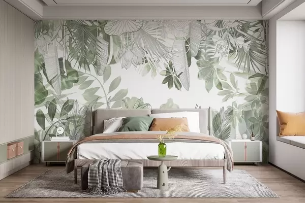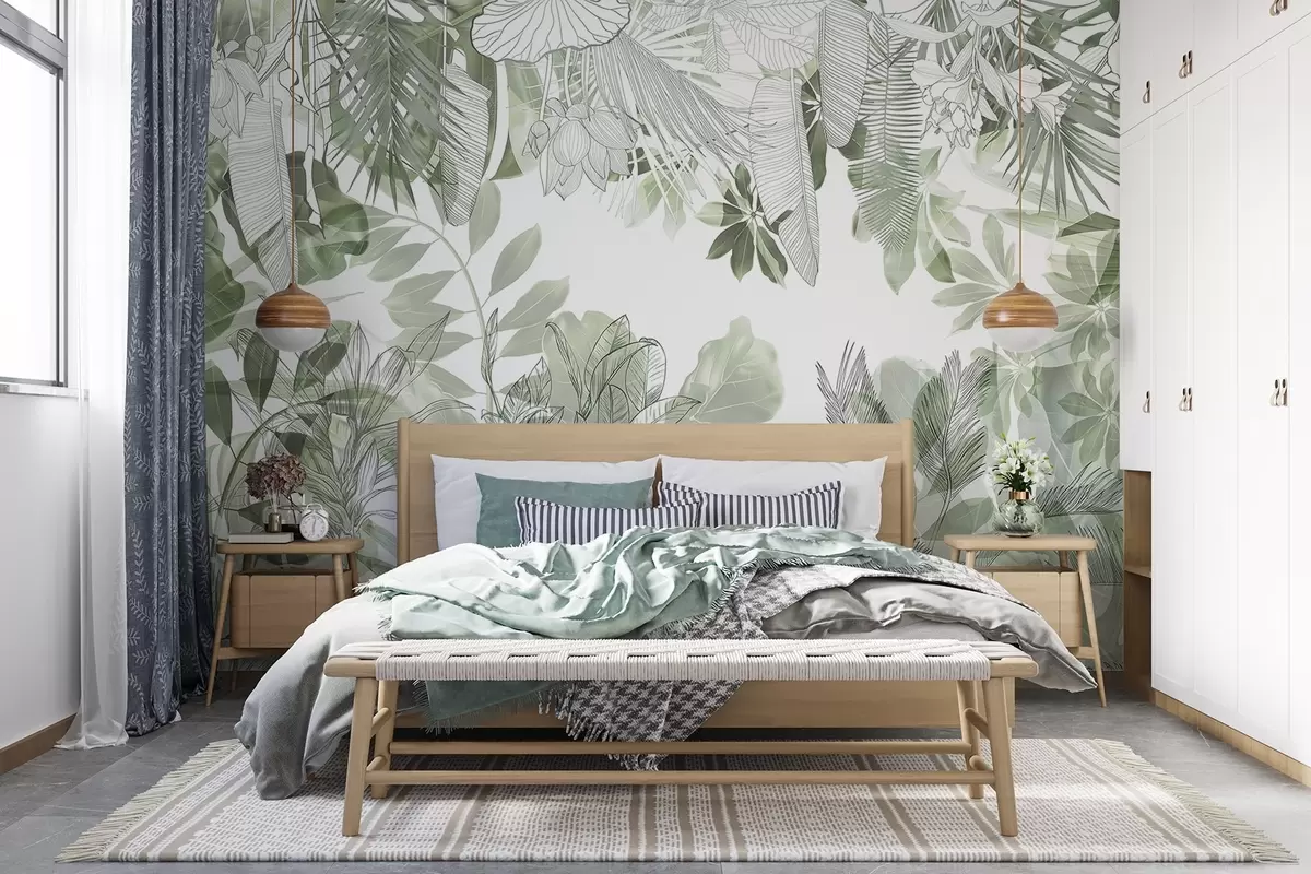 murales de pared Plantas y hojas tropicales con estampado de jungla verde sobre fondo blanco w08823
