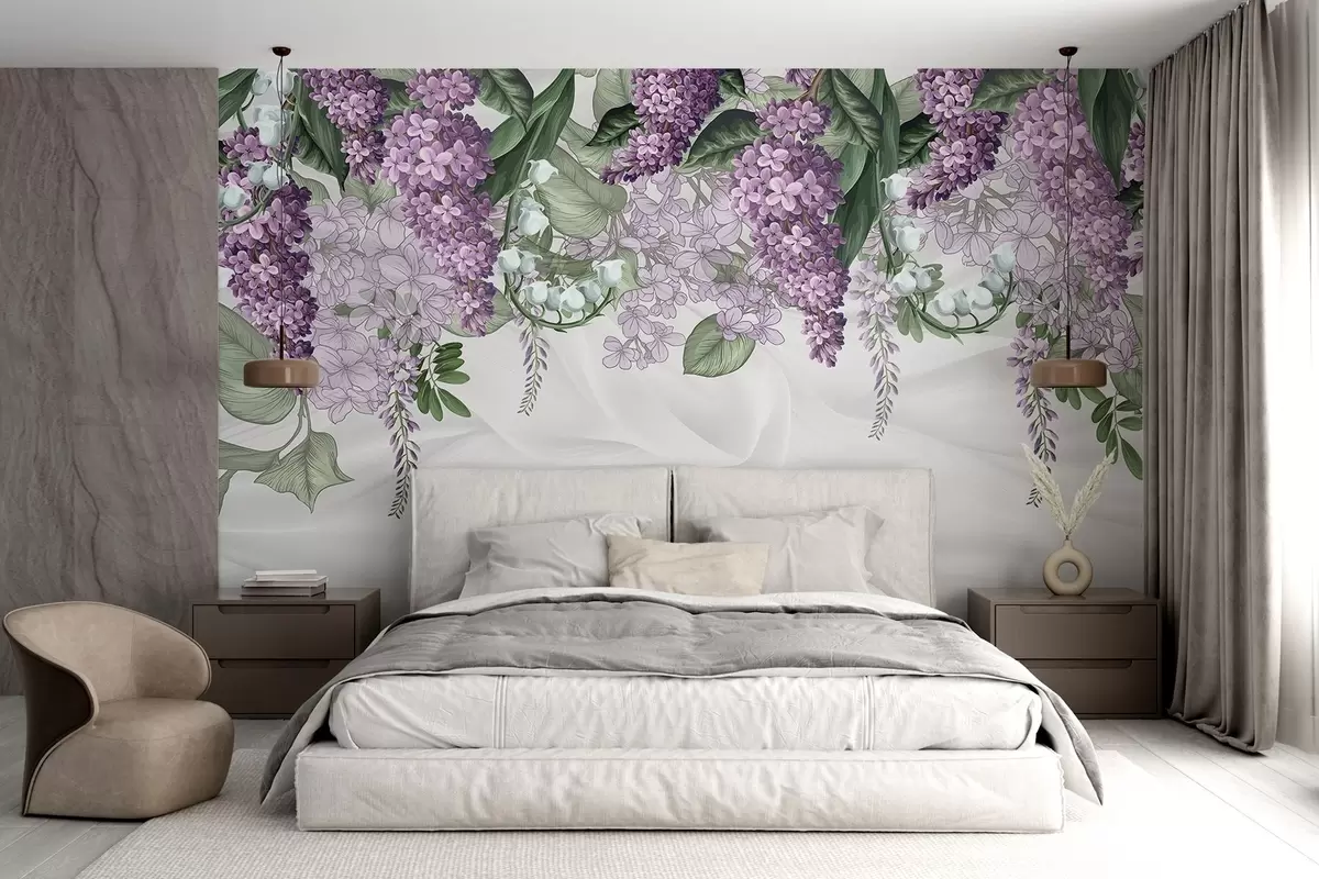 murales de pared Flores de color lila pastel y hojas verdes sobre fondo blanco con textura de imitacion de seda fabriс w08825