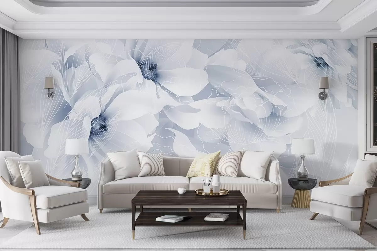 Fotomurales Flores de peonía en tonos pastel con delicados pétalos blancos y azules y líneas blancas sobre fondo azul claro Nr. w08826