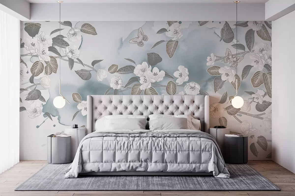 Fotomurales Flor de cerezo rama con flores, hojas, mariposas en una acuarela de color azul claro con textura de fondo Nr. w08831v1
