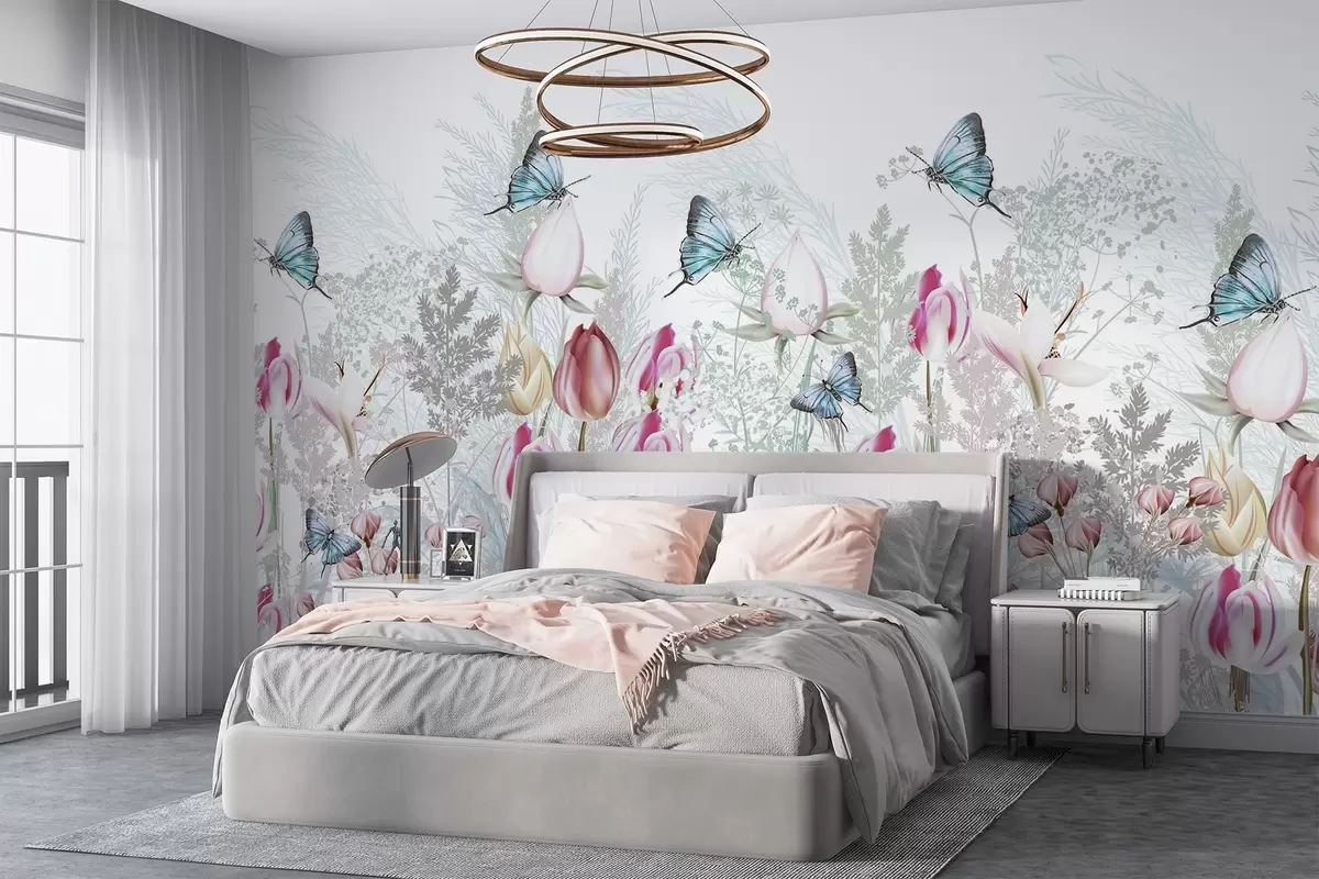 murales de pared Estampado en tonos pastel con flores de tulipán, hierba y mariposas volando en un jardín w08834