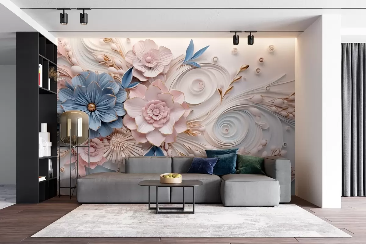 murales de pared Una delicada composición floral en tonos rosas y azules con un suave fondo en relieve w08847