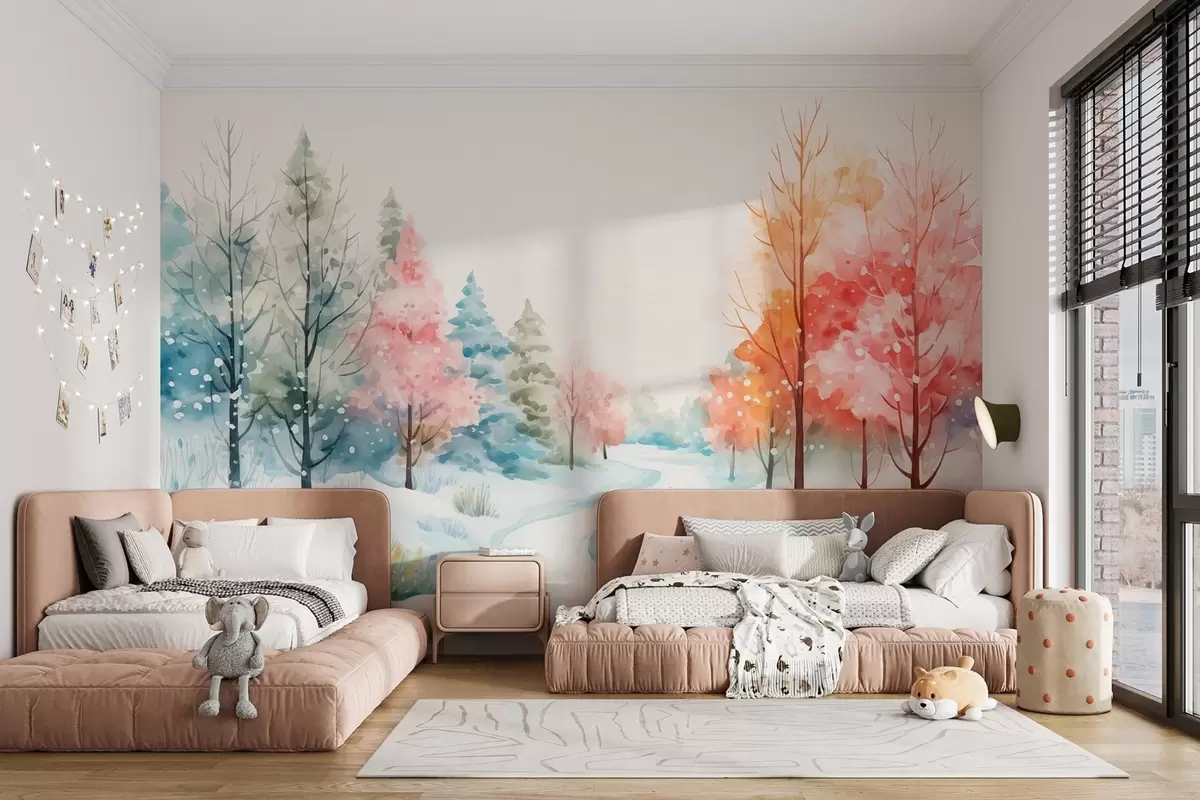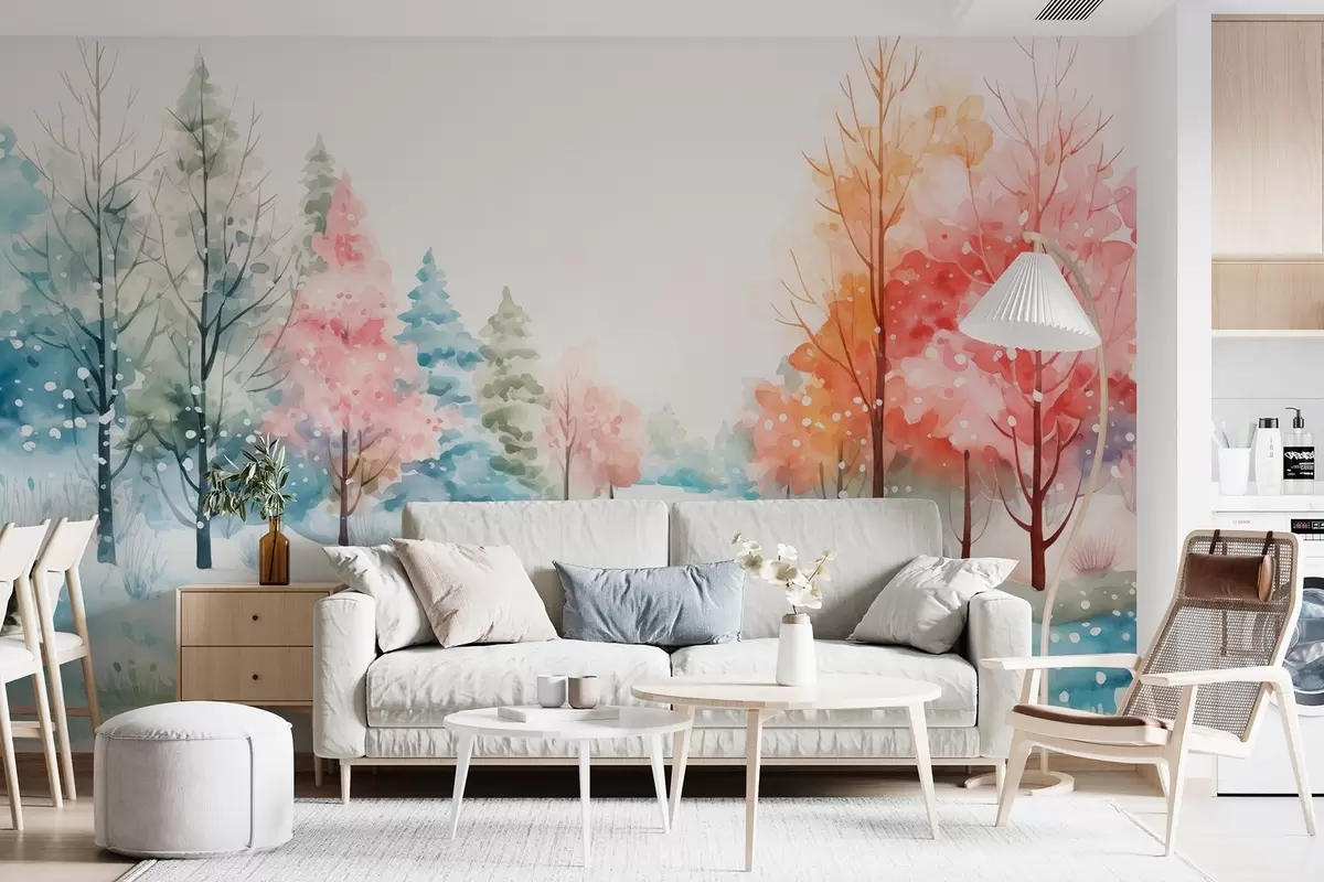 Fotomurales Un vibrante bosque invernal en estilo acuarela Nr. w08856