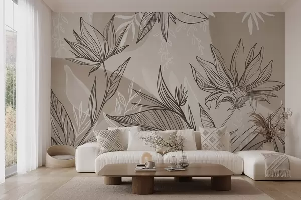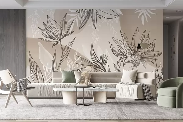 Fotomurales Línea floral con grandes hojas y flores sobre un fondo de acuarela beige Nr. w08865v1
