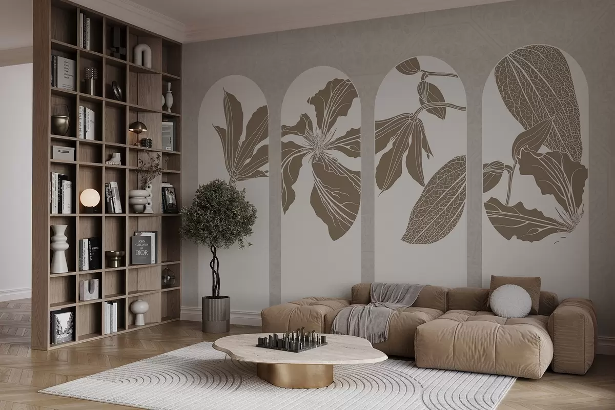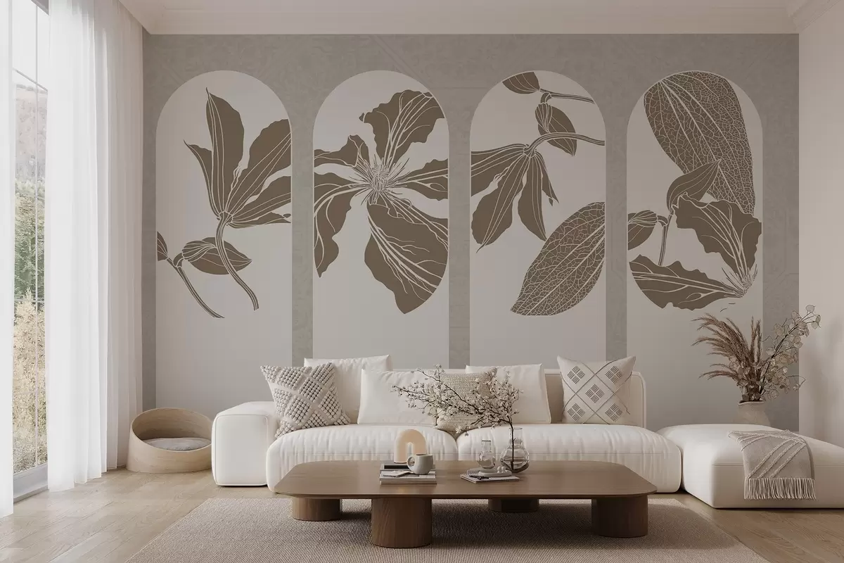 murales de pared Elegantes arcos con diseños florales en beige y blanco, sobre fondo beige texturado, estilo minimalista w08866