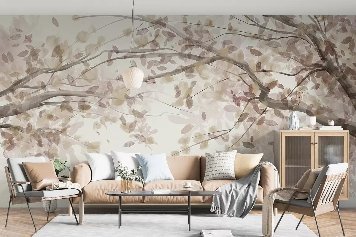 Fotomurales Ramas en flor con hojas beige, colores suaves, detalles delicados, estilo acuarela, sobre fondo claro Nr. w08867v1