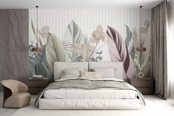 Fotomurales Hojas tropicales con suaves colores pastel, verde claro , rosa claro y marrón claro, líneas verticales en el fondo Nr. w08892