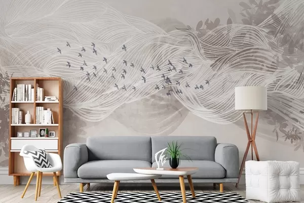 Fotomurales Bandada de pájaros volando sobre el paisaje abstracto de arte lineal ondas de color beige con textura, colores suaves , diseño minimalista Nr. w08898