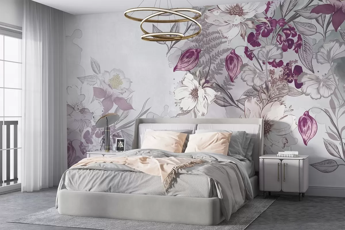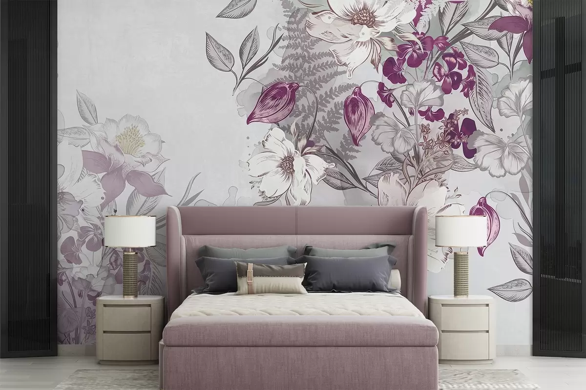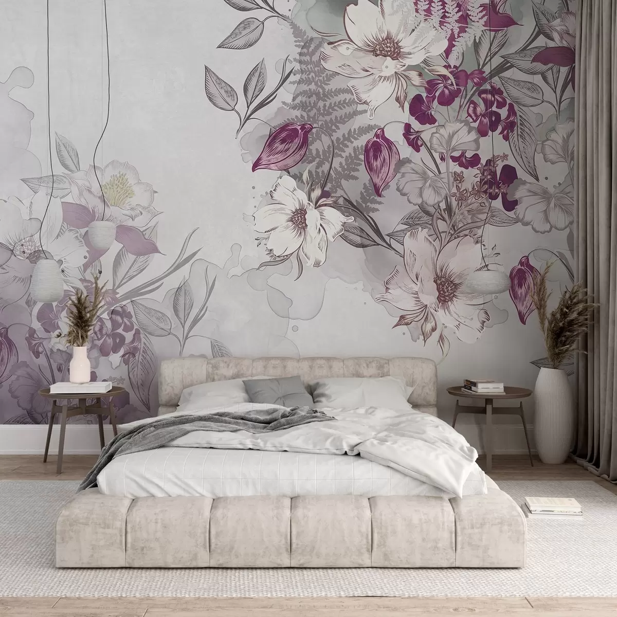 murales de pared Flores con pétalos, hojas y tallos blancos y morados , efecto acuarela , fondo gris claro texturado  w08899