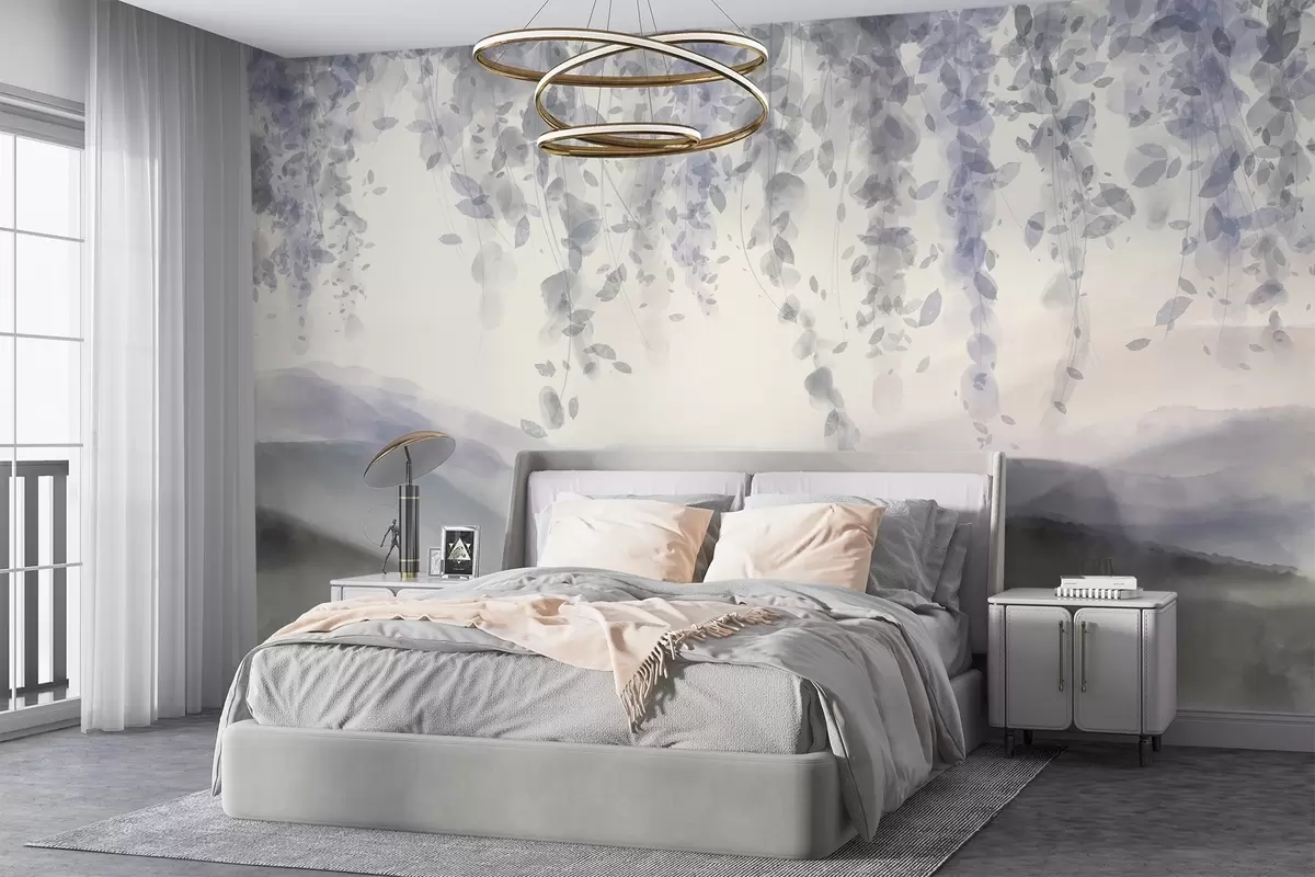 Fotomurales Hojas de glicina colgando sobre montañas azuladas, suaves colores pastel azul y gris, paisaje estilo acuarela Nr. w08909