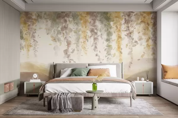 Fotomurales Hojas de glicina colgando sobre montañas azuladas, suaves colores pastel amarillos y marrones, paisaje estilo acuarela Nr. w08909v1