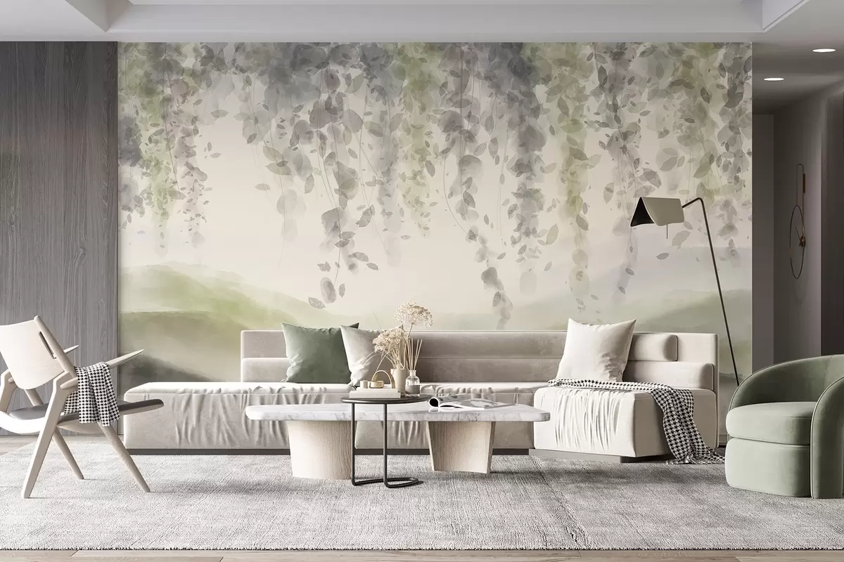 Fotomurales Hojas de glicina colgando sobre montañas azuladas, suaves colores pastel verde y beige, paisaje estilo acuarela Nr. w08909v2