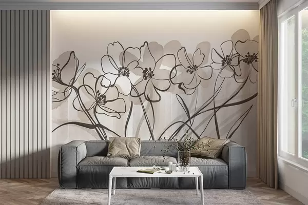 Fotomurales Flores minimalistas line-art con pétalos beige y marrones, tallos largos, fondo beige claro Nr. w08918