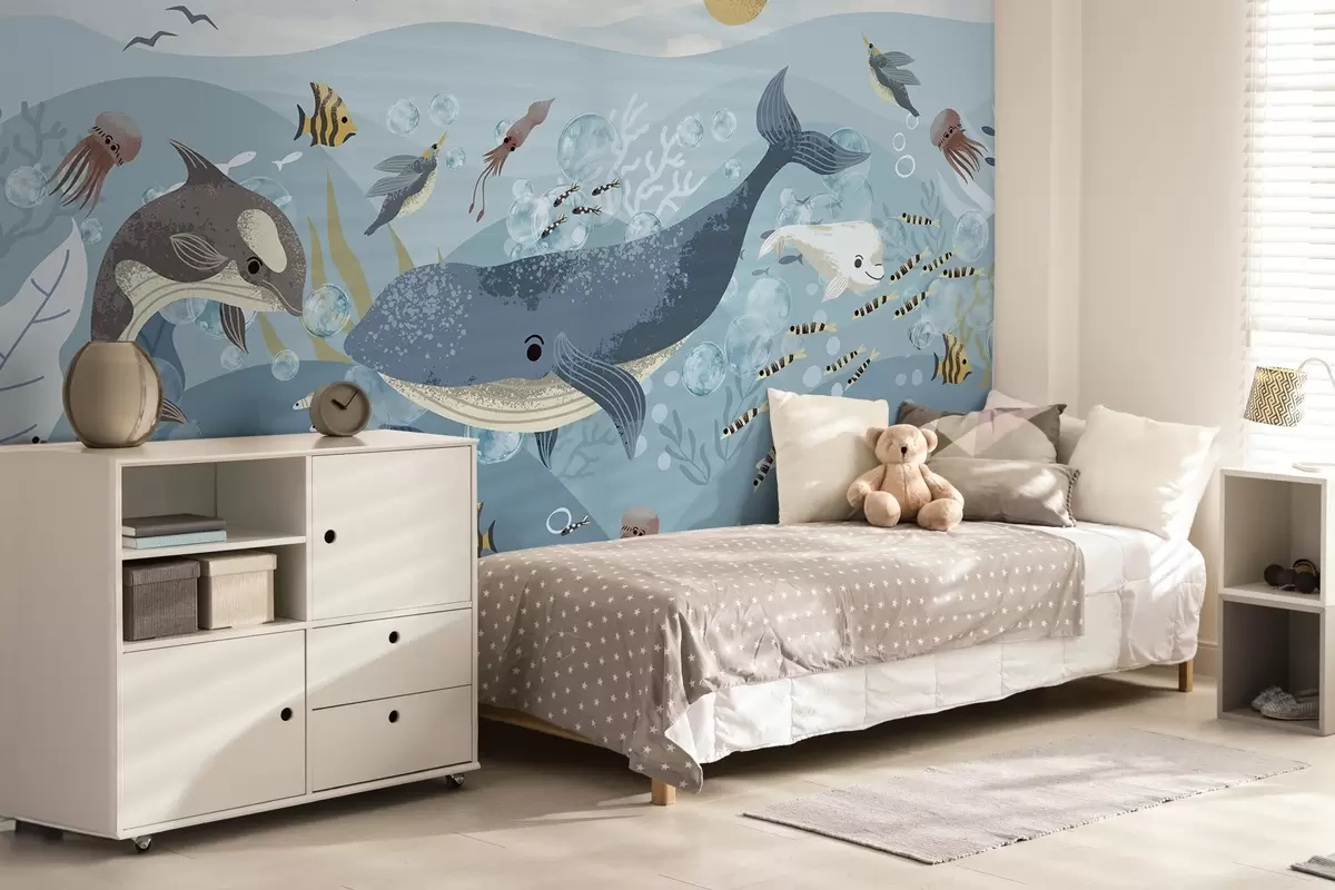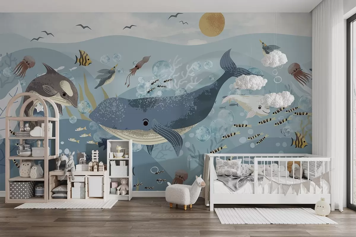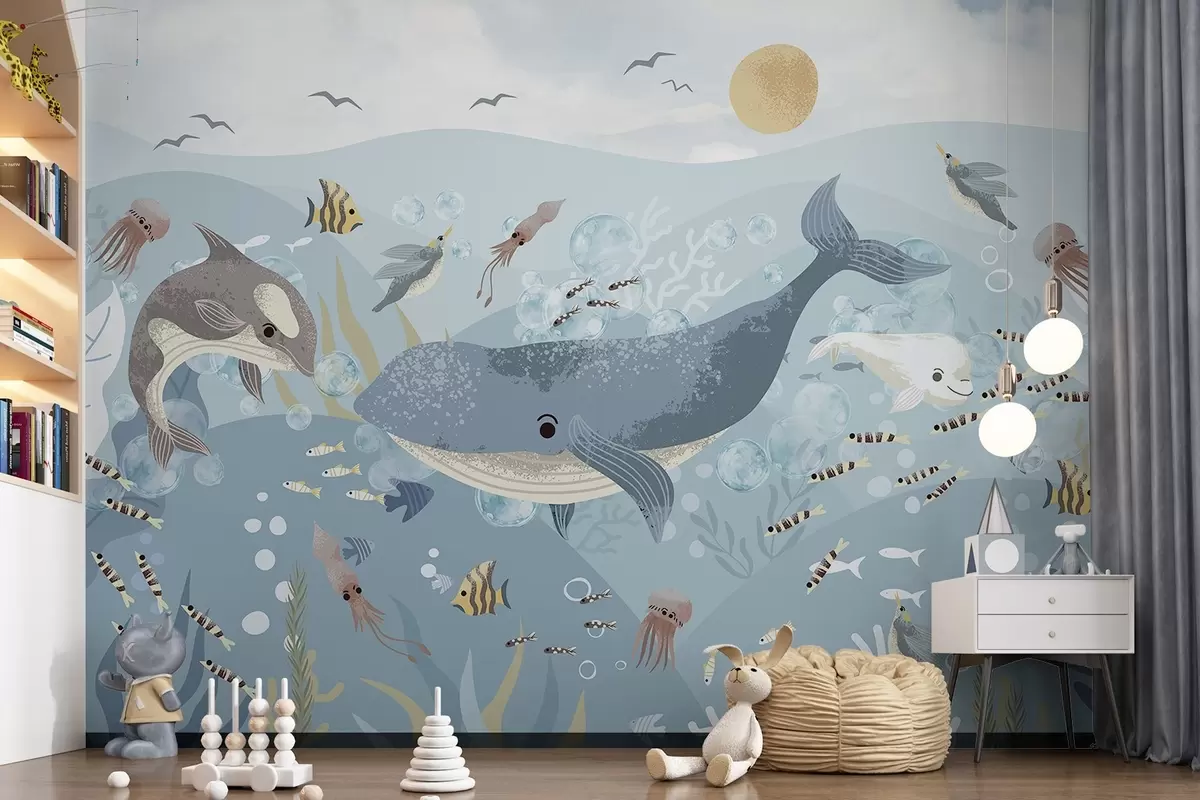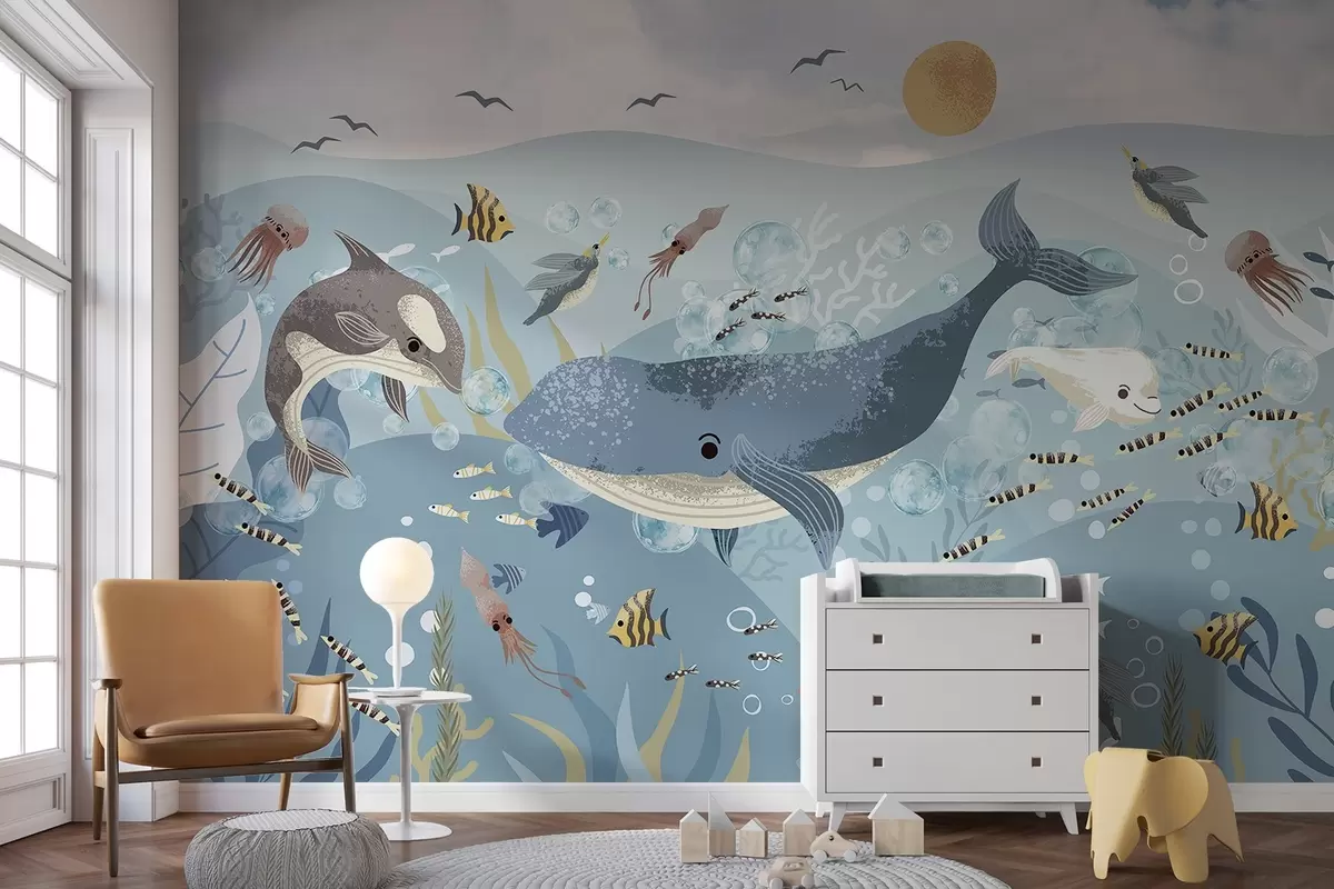 Fotomurales Ilustración infantil linda impresión con ballena azul rodeada de peces, calamares, medusas en un océano azul con burbujas Nr. w08921